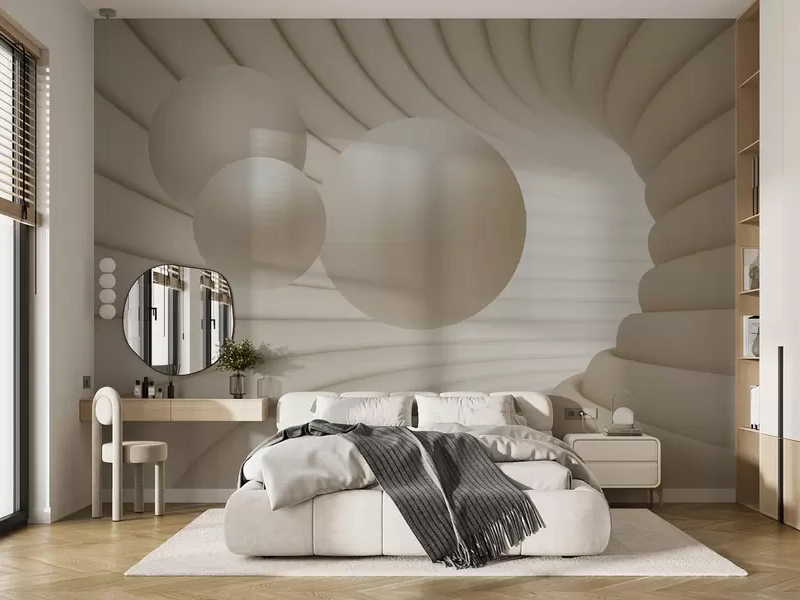 Tapeta sa 3D efektom kružnih formi u nijansama bež i peska donosi dubinu i sofisticiranost u prostor. Njen apstraktni dizajn vizuelno proširuje zid, stvarajući efekat prostora i mekoće. Idealna za moderne spavaće sobe i enterijere u Japandi i minimalističkom stilu.
