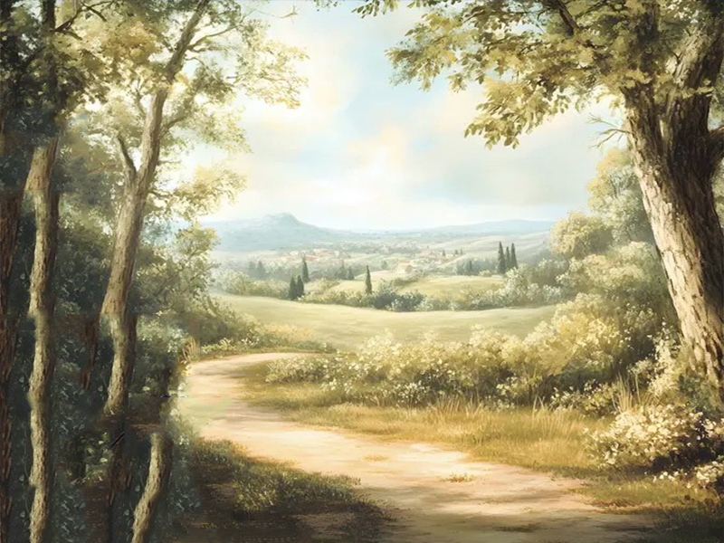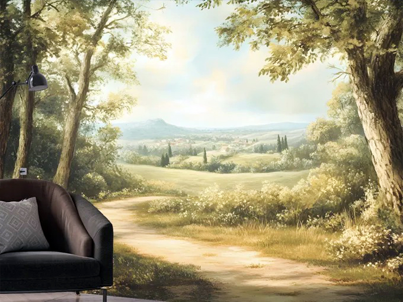 Romantičan pejzaž sa sunčanom stazom koja vodi kroz zelene brežuljke – fototapeta koja prostoru daje toplinu, dubinu i klasičnu eleganciju.