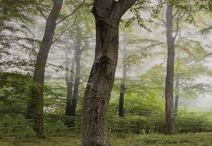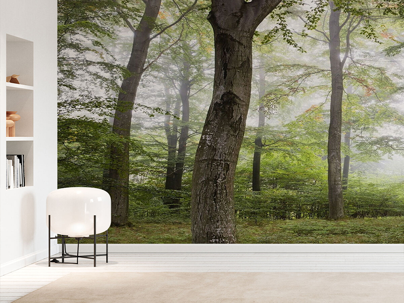 Umirujuća fototapeta sa prozračnom šumom i blagom maglom koja prostoru donosi osećaj svežine, prirodne harmonije i dubokog mira.
