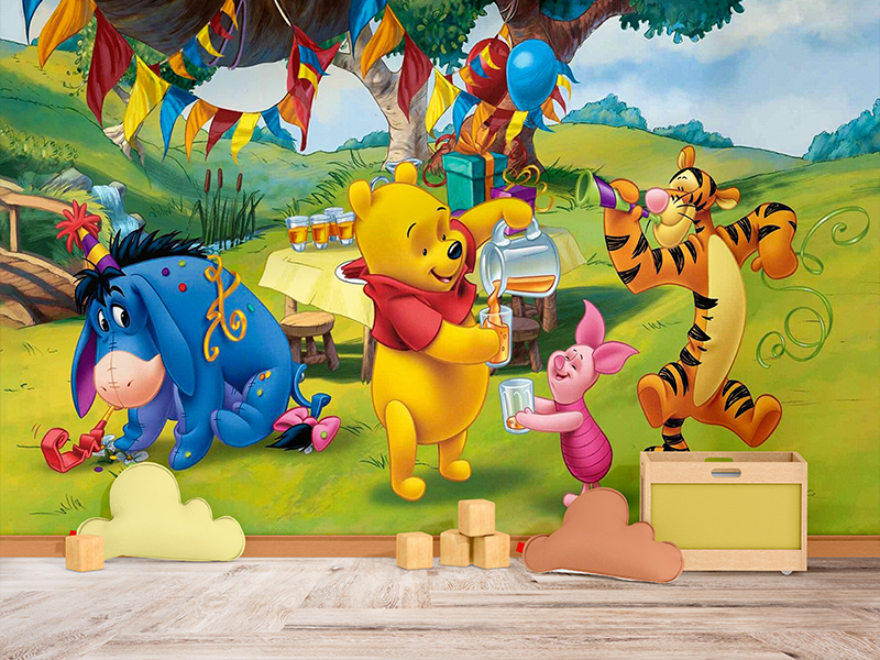 Vesela i šarena fototapeta sa Medom Puhom i prijateljima u razigranoj šumskoj proslavi, savršena za dečiju sobu punu radosti i topline.