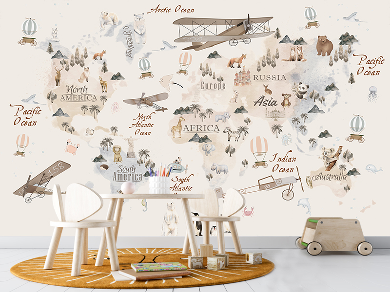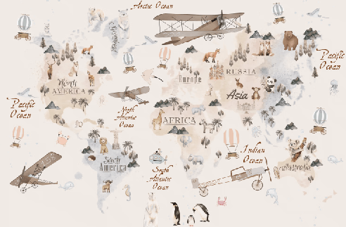 Fototapeta „Svet viđen očima pilota“ donosi svet iz jedne drugačije perspektive – iz visine, gde se kontinenti pretvaraju u priče, a nebo postaje prostor igre i snova. Mapa sveta je predstavljena u nežnim, prigušenim tonovima, sa pažljivo uklopljenim ilustracijama aviona, balona i životinja koje diskretno prate ritam kompozicije.