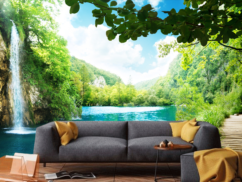 Smaragdna boja vode i bogate nijanse zelenog lišća stvaraju savršen kontrast koji prostoru donosi svežinu i prirodnu eleganciju. Svetlost koja prolazi kroz krošnje drveća dodatno naglašava dubinu pejzaža i stvara utisak da se zid otvara ka skrivenom prirodnom raju.