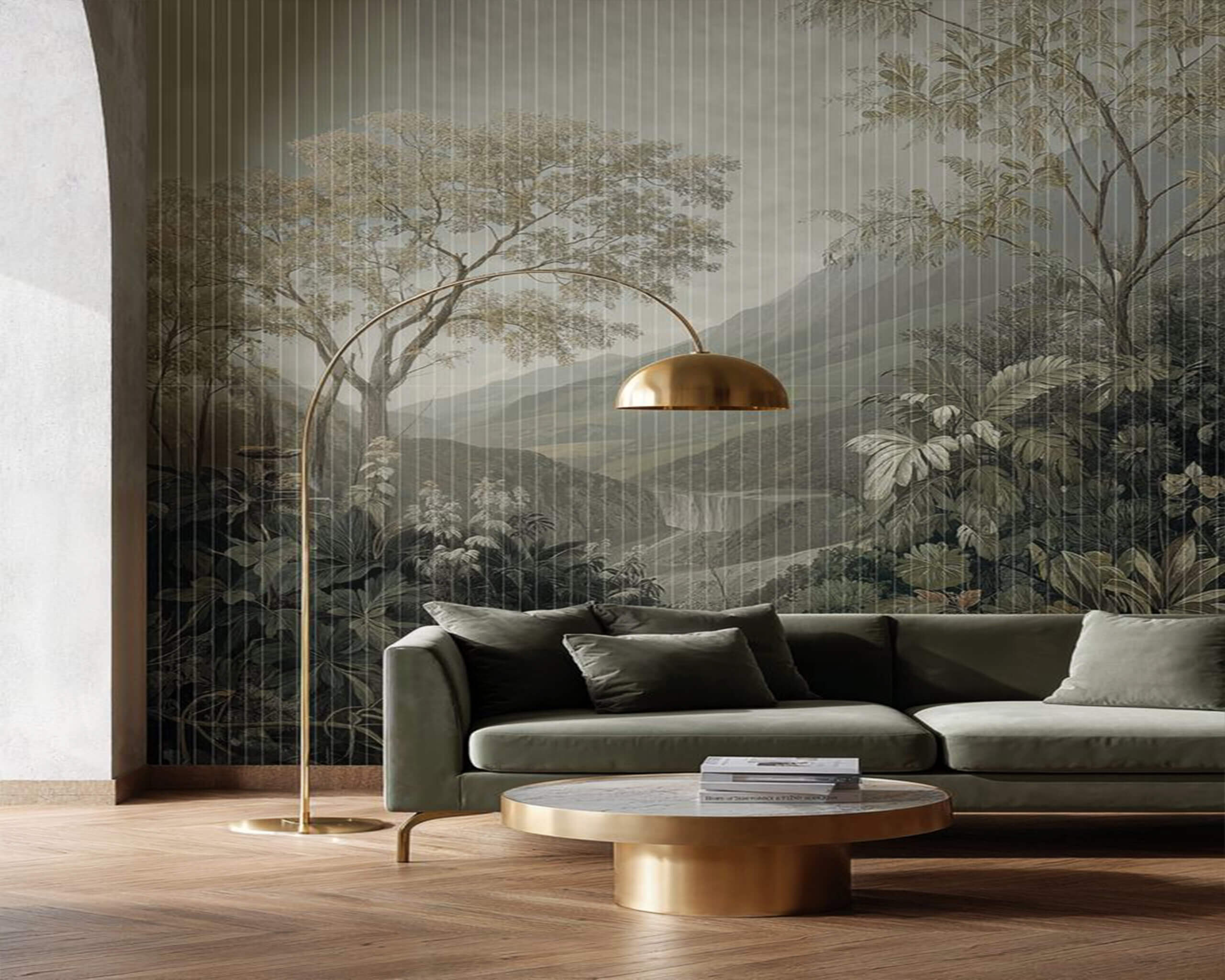 Elegantna fototapeta sa suptilnim pejzažom dolina i drveća u zemljanim tonovima, savršena za sofisticirane i moderne enterijere.