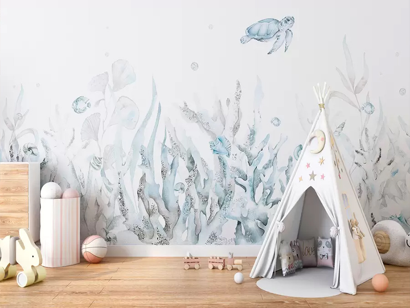 Nežna pastelna fototapeta inspirisana podvodnim svetom, koja prostoru donosi osećaj smirenosti, lakoće i tihe radoznalosti kroz mekane oblike i suptilne boje.