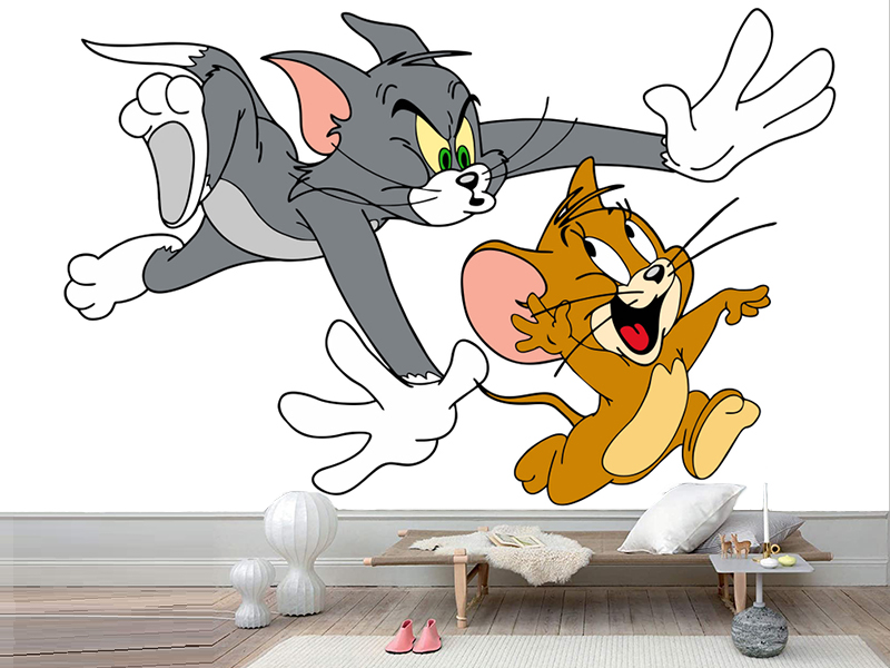 Minimalistička i dinamična fototapeta sa Tomom i Džerijem u klasičnoj jurnjavi, bez pozadine – samo čista akcija na zidu. Savršen izbor za modernu dečiju sobu.