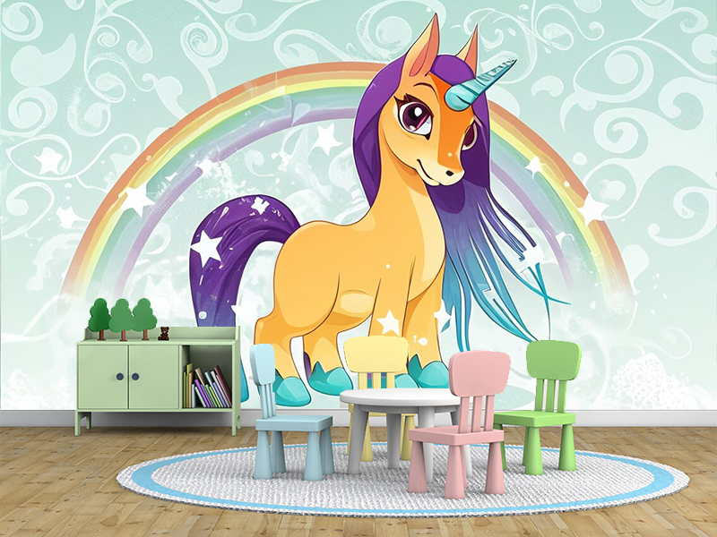 Razigrana i vedra fototapeta sa jednorogom koja unosi radost, boje i pozitivnu energiju u dečiju sobu. Savršen izbor za prostor u kome se igra, uči i mašta bez granica.