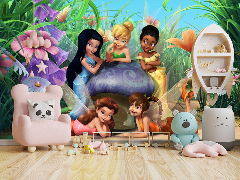 Čarobni susret vila u srcu prirode. Ova fototapeta donosi toplinu prijateljstva, nežnu magiju i bajkovitu atmosferu koja pretvara dečiju sobu u vilinsku oazu mašte.