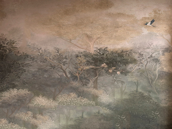 Elegantna fototapeta u nežnim, prigušenim tonovima koja donosi atmosferu tihe, romantične šume i prostoru daje osećaj umetničke sofisticiranosti.