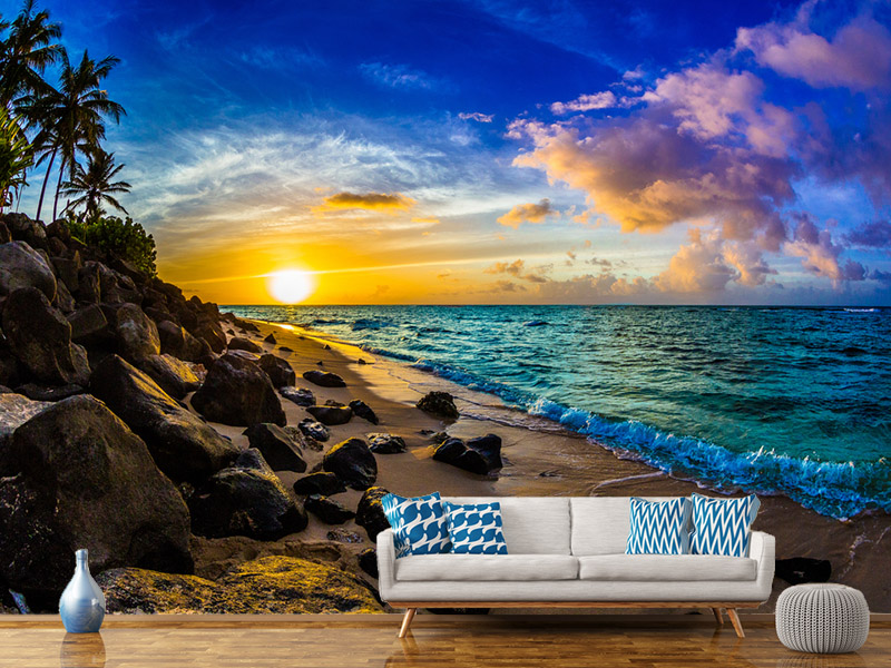 Oštre stene na plaži predstavljaju kontrast nežnom zalasku sunca uz delikatno plavetnilo mora i obrise oblaka. Ova kompozicija čini savršen pejzaž na tapeti koja ističe svu lepotu prirode.