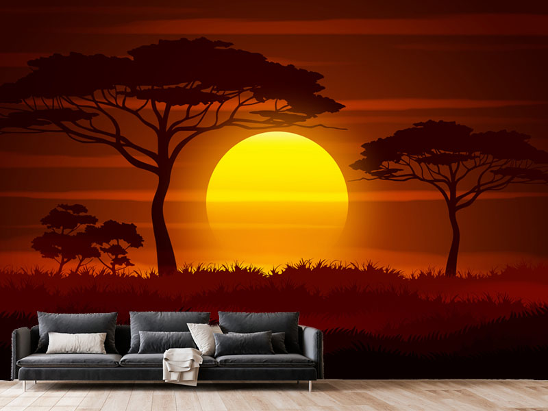 Afrički zalazak sunca na ovoj tapeti koji asocira na scenu iz Kralja lavova. Specifičan zalazak poput ovog može oplemeniti i Vaš prostor.