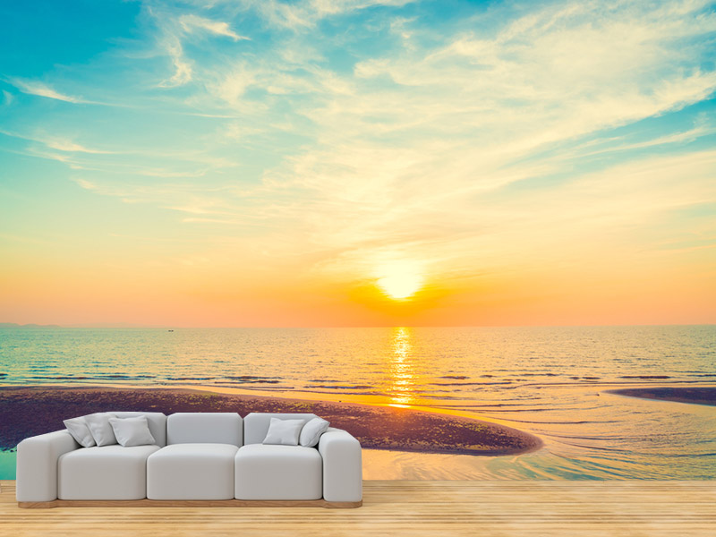Plavetnilo mora i neba, upotpunjeno zlatnim zracima sunca, koje nudi čitav spektar pastelnih boja na nebu, učiniće da ova tapeta ostavlja bez daha i unese živosti u Vaš dom.