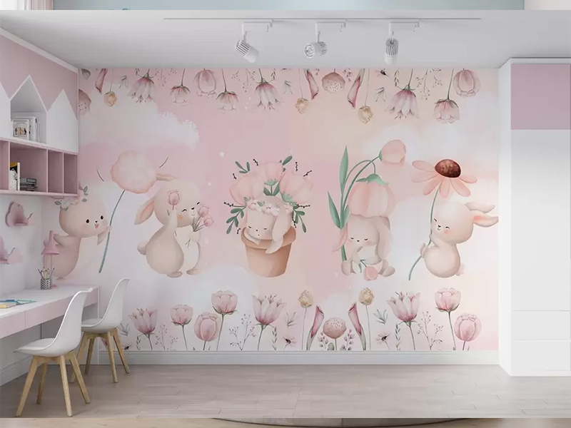 Pastelna paleta roze, puder-bež i blagih zelenih tonova stvara lagan i svetao ambijent koji ne opterećuje zid. Cvetni detalji unose ritam i svežinu, dok zečići dodaju toplinu i osećaj bliskosti, čineći prostor prijatnim i vedrim.