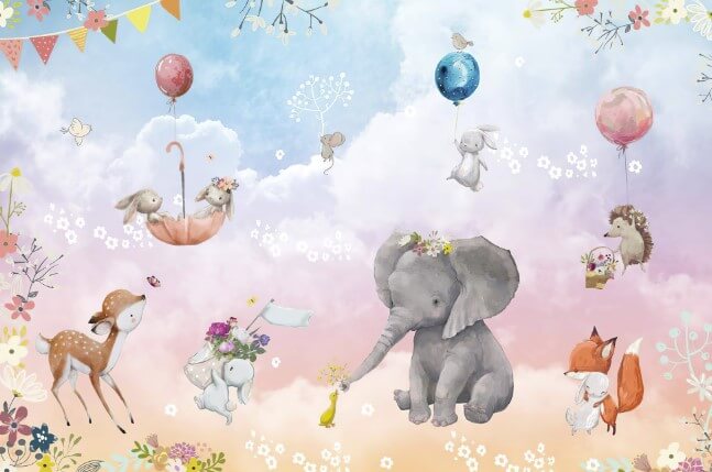 Dizajn fototapete prikazuje sanjivu pastelnu pozadinu sa blagim prelazima roze, plave i toplih krem tonova, koja podseća na nebo u zoru. Razigrane životinje – slonić, zeka, ježić, lisica i mali miševi – nežno lebde među oblacima, balonima i kišobranima, stvarajući osećaj lakoće i bezbrižnosti. Akvarel stil ilustracije daje mekoću i umetničku notu, čineći zid toplim i prijatnim za najmlađe.