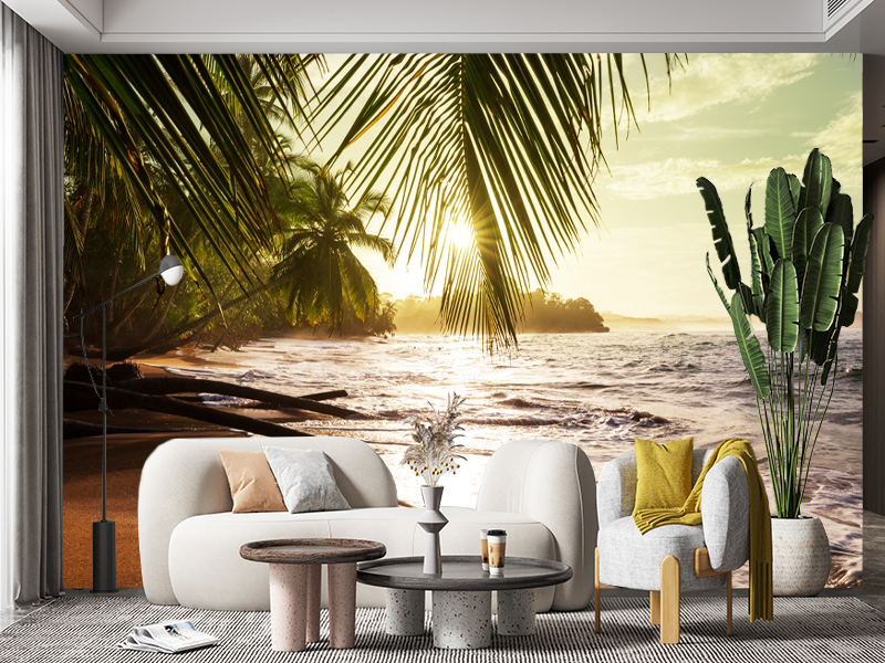 Topla svetlost zalaska sunca koja prolazi kroz palme i obasjava talase stvara egzotičan i umirujući ambijent. Idealna za sve koji žele da u svoj prostor unesu osećaj luksuza, topline i tropskog mira.