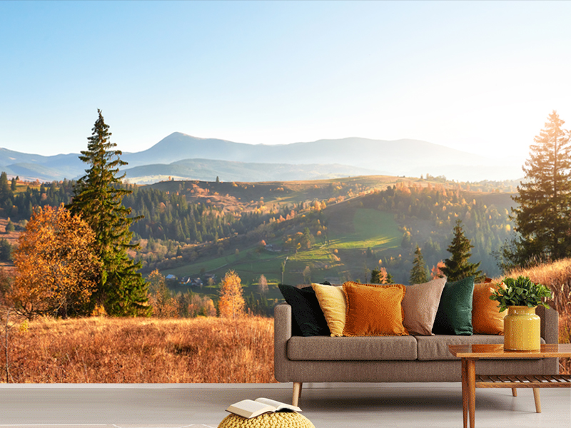 Topla pejzažna fototapeta koja prikazuje prostrane planinske doline obasjane zlatnim svetlom, stvarajući atmosferu mira, širine i prirodne elegancije.