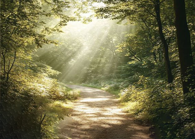 Umirujuća fototapeta sa šumskom stazom obasjanom sunčevim zracima koja prostor pretvara u svetlu oazu spokoja i prirodne harmonije.